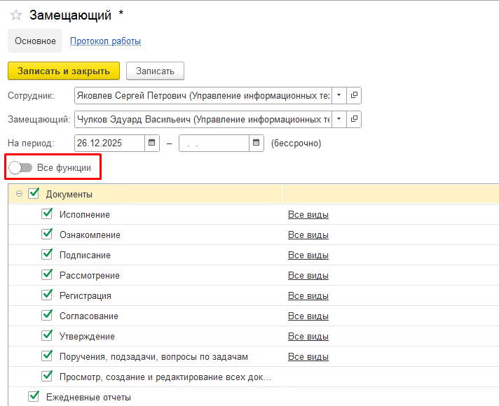 Вы можете выбрать конкретные виды задач, которые сможет выполнять Заместитель, убрав отметку «Все функции» и отредактировав список, убрав «галочки» с задач.