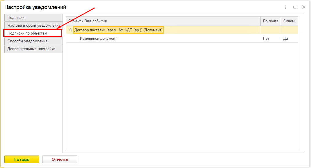 Лайфхак: Все установленные подписки на уведомления по конкретным документам, рассмотренные в предыдущем пункте, можно увидеть на вкладке «Подписки по объектам».