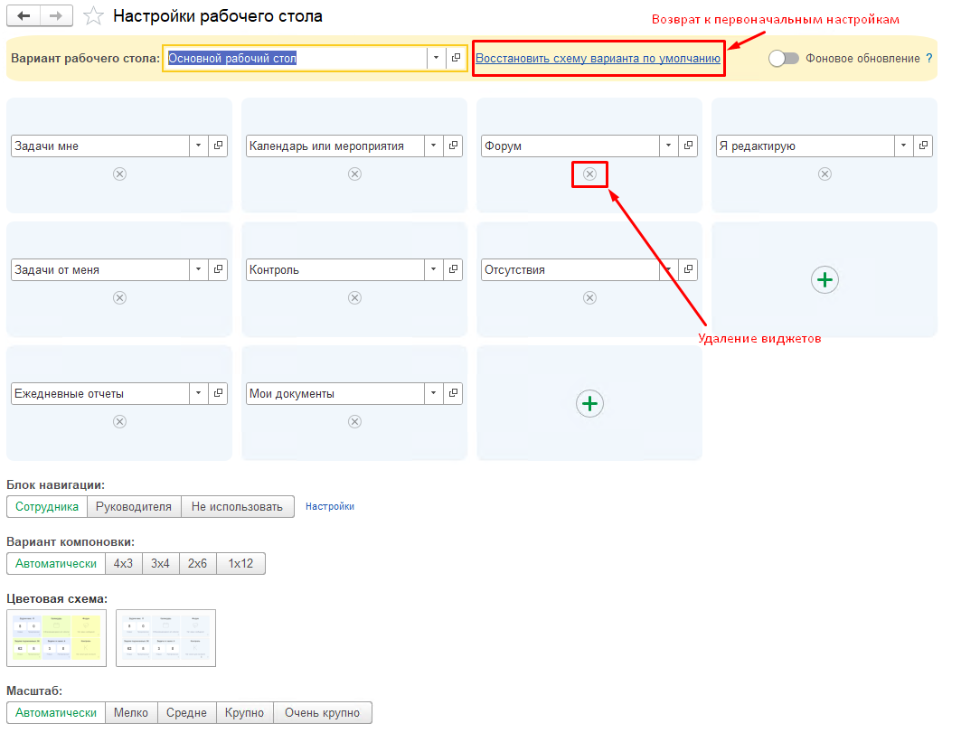 Примечание: настройки всегда можно вернуть к первоначальным по гиперссылке «Восстановить схему варианта по умолчанию»